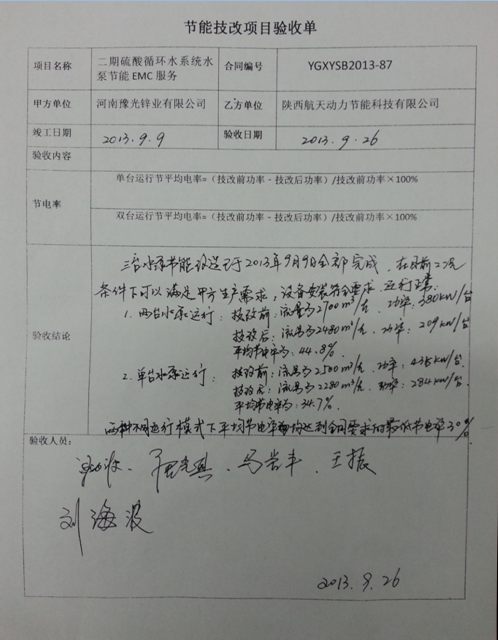 硫酸循環(huán)水節能改造項目于2013年9月9日竣工,9月26日驗收。驗收時(shí)雙方確認節能量:兩臺水泵工作時(shí)平均節能率為44.8%;單臺水泵工作時(shí)平均節能率為34.7%。